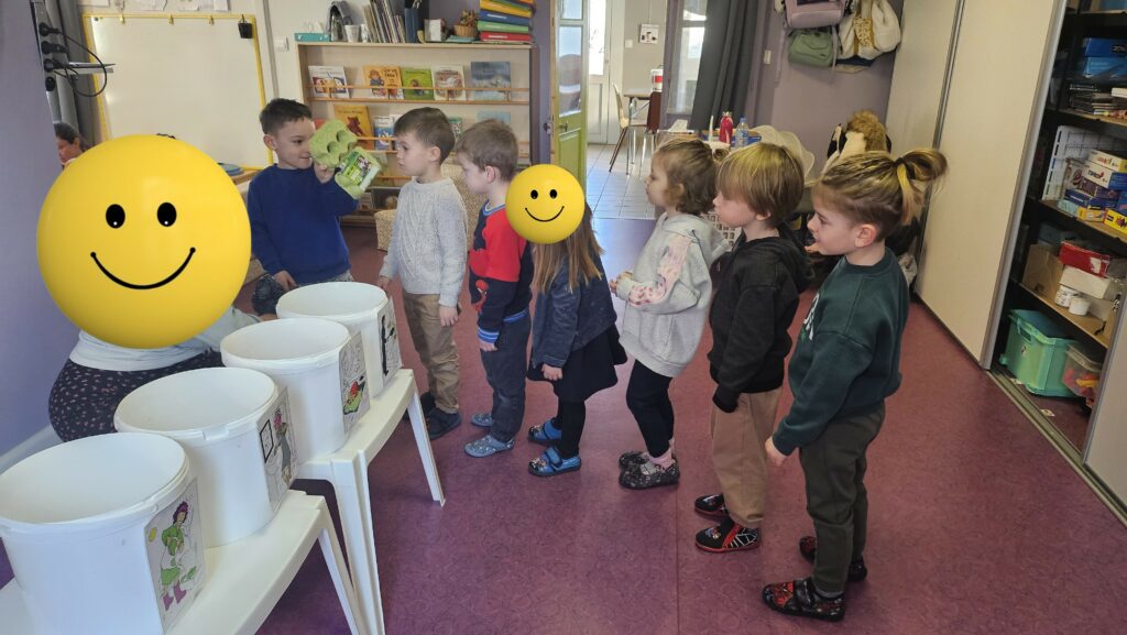 – un sur la provenance des déchets. Tout le monde produit des déchets dans toutes les pièces de la maison ! Les enfants piochaient un déchet dans un sac, ils devaient dire pourquoi l’objet en question était devenu un déchet, dans quelle pièce de la maison ce déchet avait été produit et le mettre dans le saut correspondant.