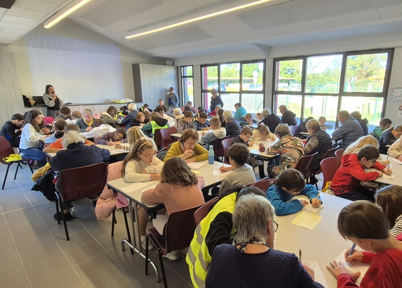 C’est une première, initiée par Aurélie de la bibliothèque les mots passants, les CM1-CM2 des deux écoles se sont rencontrés, et fait équipe avec des papis et mamies de la commune.